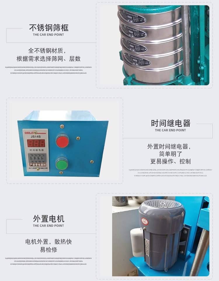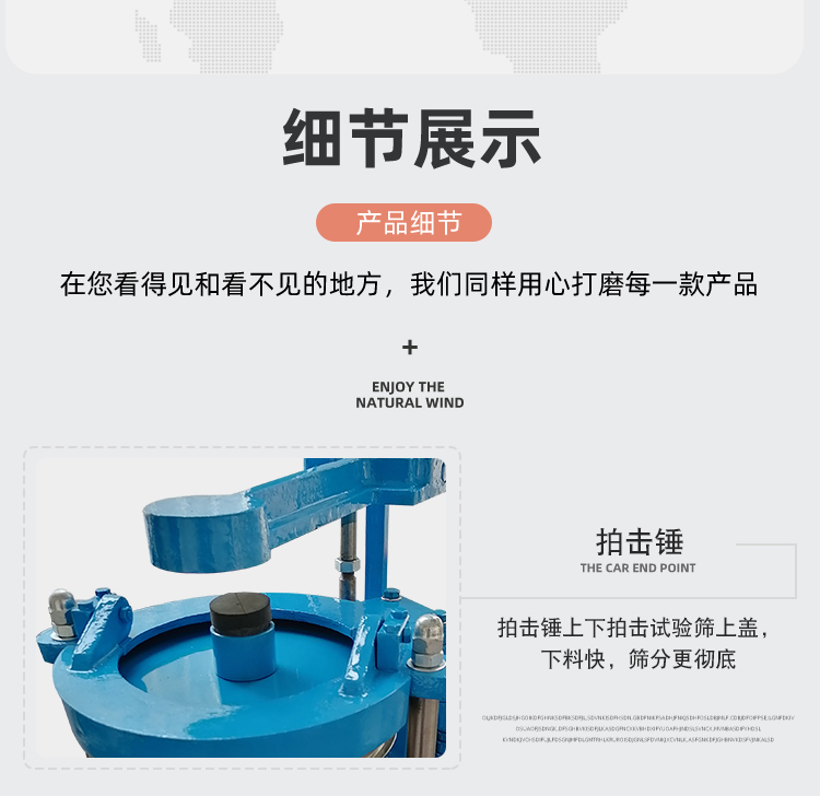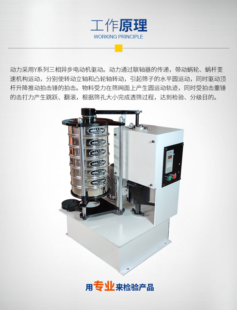 Product introduction拍擊篩又叫拍擊式標準振篩機,它是一種超精細篩分設備,用于普通磨料粒度檢查分級,超硬材料生產分級等。拍擊篩尤其適用于金剛石微粉、超硬材料行業生產分級。