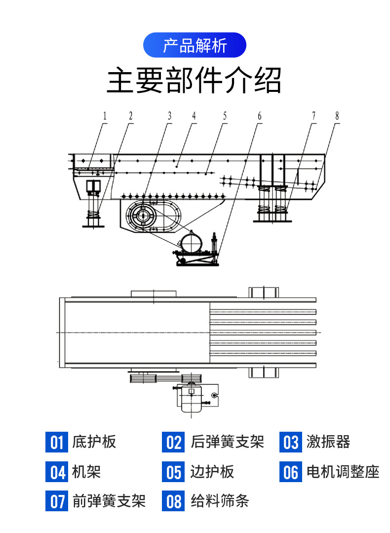 GZT系列振動給料機新型振動電機驅動,該系列振動給料機用于粗破碎機前的均勻給料,同時由于棒條篩面的作用,又能除掉泥土等細小物料,達到預先篩分的功能,能夠提高粗碎能力,該系列振動給料機新型振動電機或激振器激振,框架式環槽鉚釘鉚接,錳鋼制造的護板和棒條,結構堅固,強度高,耐沖擊,耐磨損,使用維護方便。