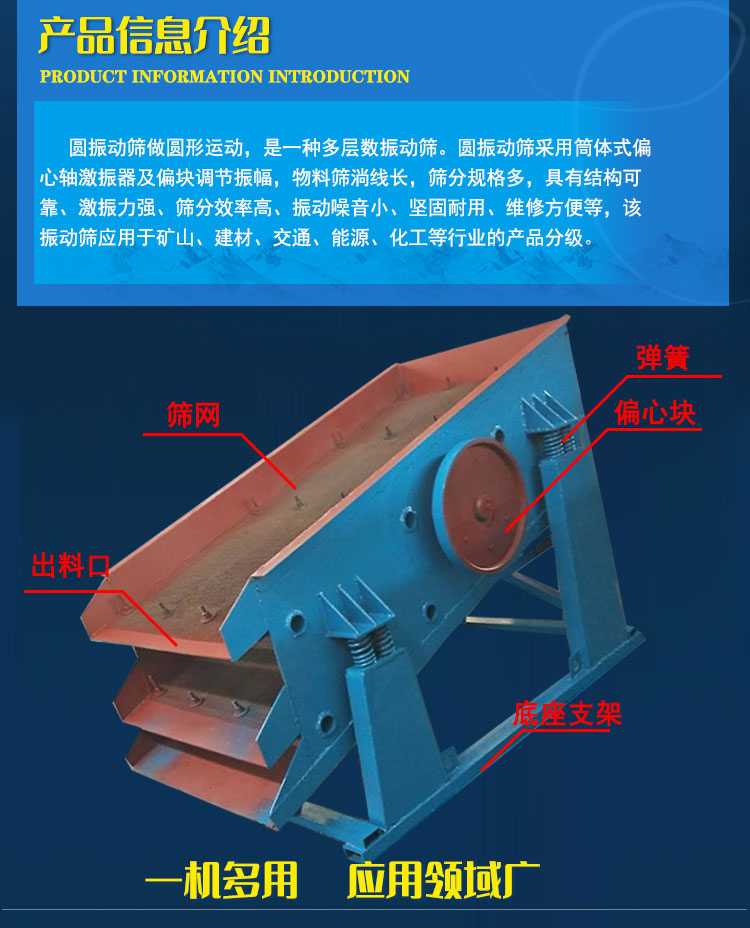 圓振動(dòng)篩由振動(dòng)源、篩體、篩網(wǎng)、減振裝置、底座等組成。