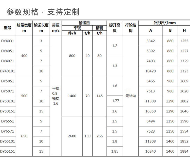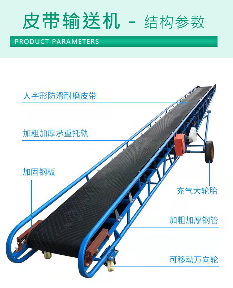 Product introduction皮帶機是皮帶輸送機的簡稱,皮帶機運用輸送帶的連續或間歇運動來輸送各種輕重不同的物品,既可輸送各種散料,也可輸送各種紙箱、包裝袋等單件重量不大的件貨,用途廣泛。